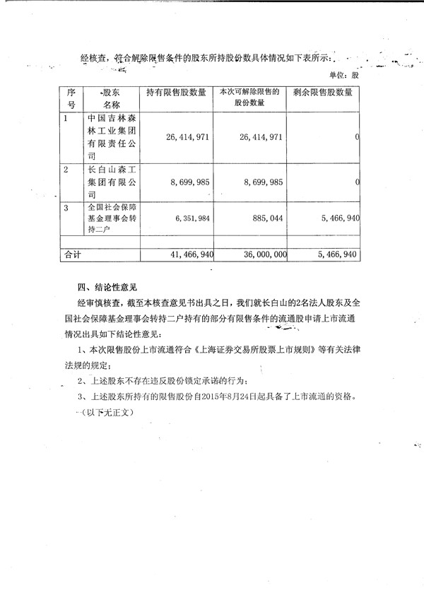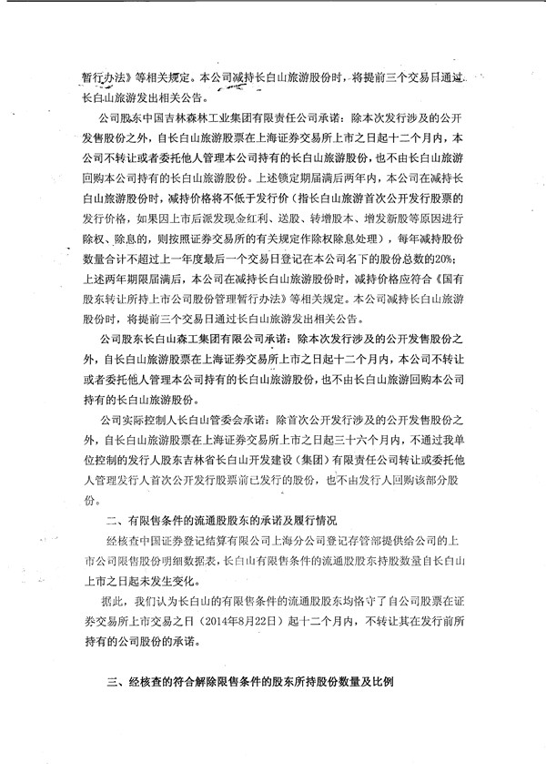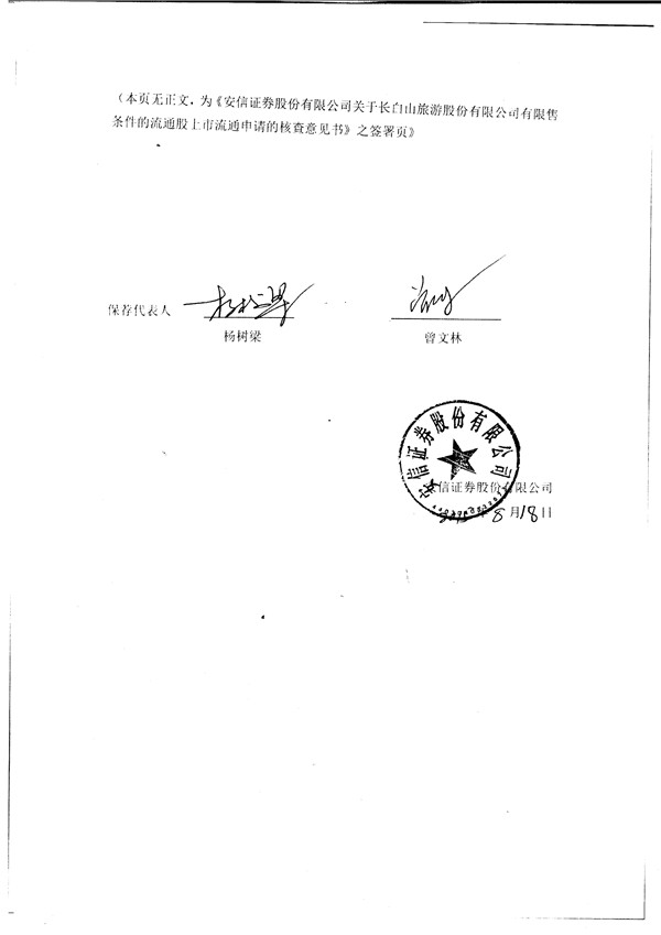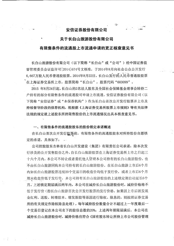 安信證券股份有限公司關于長白山旅游股份有限公司有限售條件的流通股上市流通申請的更正核查意見書